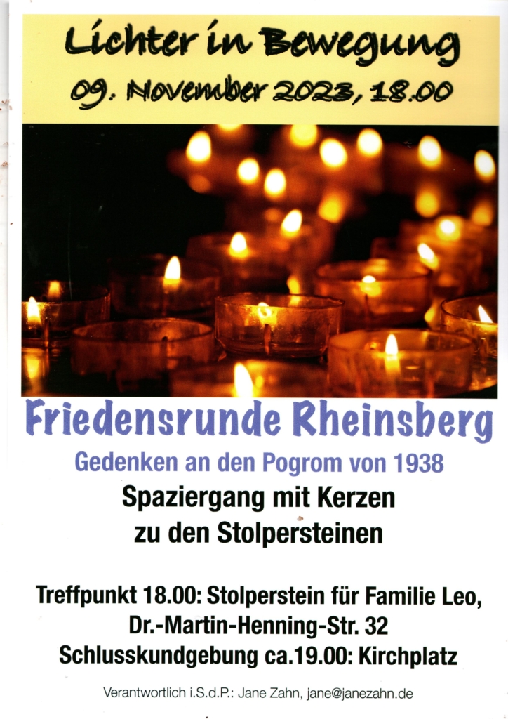 Damit nie wieder geschehe, was damals geschah, als jüdische Mitbürger entrechtet, gequält, beraubt, zur Flucht gezwungen und ermordet wurden, erinnerten etwa 50 Menschen am 09. November mit ihrem gemeinsamen Gang zu den Stolpersteinen in Rheinsberg an das Schicksal der Familien Leo, Hoffmann, Hirschfeld und Weinstock.